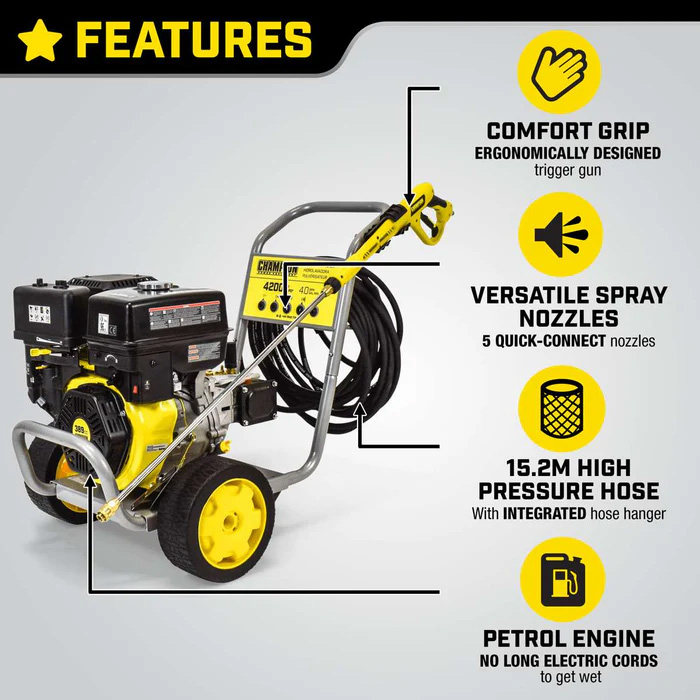 Champion Power Equipment 4200-PSI on madala profiiliga bensiinimootoriga survepesur, mida käitab 389cc ühesilindriline OHV mootor. Seade arendab surveks kuni 4200 PSI ja vooluhulgaks 15,1 l/min, sobides nii terrasside, aedade, autode, paatide kui ka töömasinate puhastamiseks.